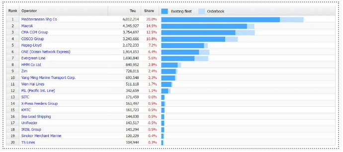 運力排名前三分別是是地中海航運MSC、馬士基航運以及達飛輪船,其中地中海航運MSC現有運力已經超過600萬TEU,同時占據的市場份額達20%。